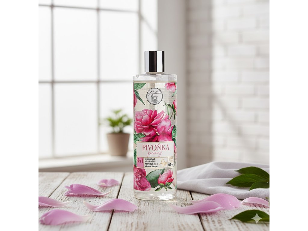Náš 4v1 kosmetický výrobek šetrně působící, je vhodný k mytí celého těla i vlasů a má podmanivou moderní vůní pivoňky. Speciální jemné složení přispívá k vysoce kvalitní péči o tělo a ke kvalitní hygieně pokožky a její vitalitě. V přípravku je kvalitní kosmetický olej ze semen kokosovníku ořechoplodého (Cocos nucifera, Arecaceae) a extrakt z květů růže (Rosa Centifolia), které společně s dalšími látkami, přispívají k šetrnému omytí pokožky bez nadměrného vysušení.