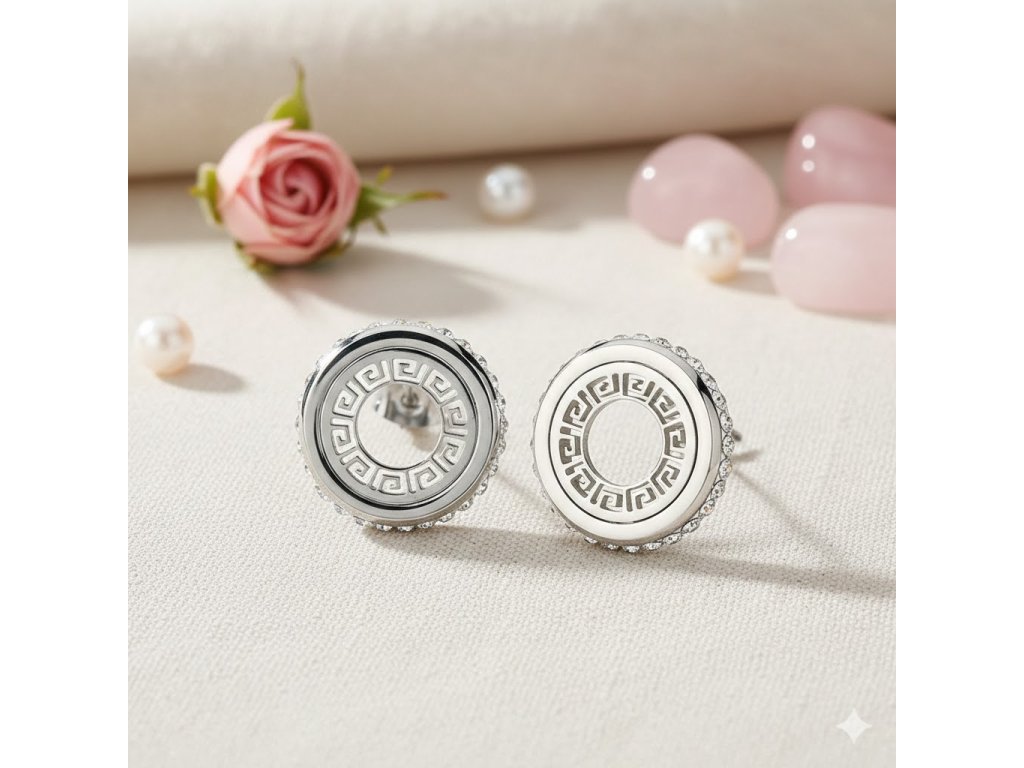 Náušnice z chirurgické oceli, gravírované se skleněnými kamínky