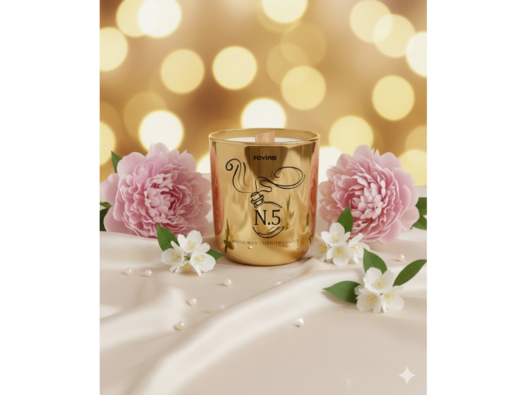 Oblíbená sójová svíčka No.5 s dřevěným knotem. Obsahuje ekologický sójový vosk a doba hoření je výrazně delší než u parafínové svíčky. Jemné praskání dřevěného knotu navozuje relaxační romantickou atmosféru.