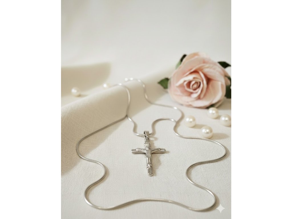 Tento duchovně laděný náhrdelník kombinuje precizní zpracování a symboliku s mimořádnou odolností chirurgické oceli. Přívěsek ve tvaru křížku s detailním vyobrazením Krista je zavěšen na jemném, ale pevném řetízku o délce 47 cm. Díky svému provedení je šperk vhodný pro každodenní nošení i jako hodnotný dárek.
