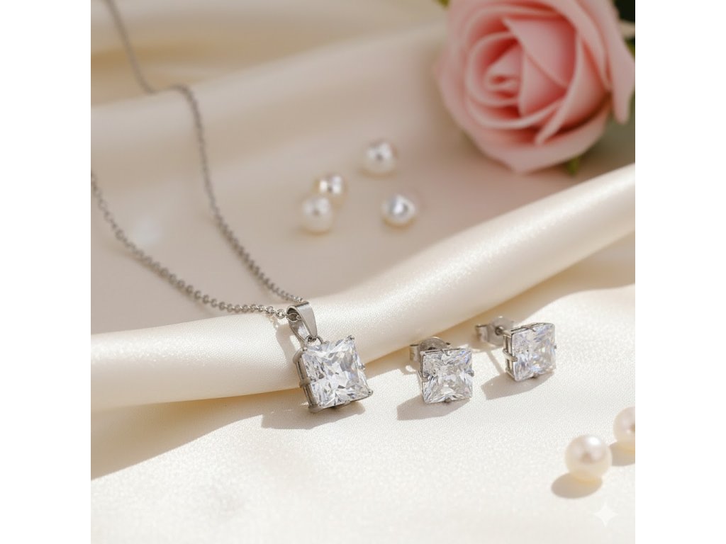 Hledáte dokonalý dárek, který vyjádří vaše city? Tato jemná souprava z leštěné chirurgické oceli kombinuje nadčasovou eleganci s moderním designem. Dominantou náhrdelníku i náušnic jsou precizně broušené zirkony ve tvaru čtverce, které svou čirou barvou (Crystal) a vysokým leskem připomínají pravé diamanty. Ideální volba pro dárky k Valentýnu, narozeninám nebo jen tak pro radost.