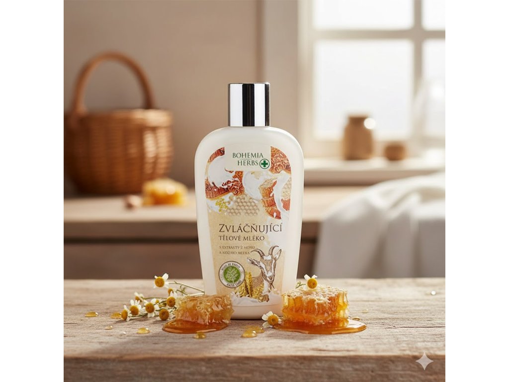 Kvalitní olejové komponenty v receptuře tělového mléka jsou doplněny o extrakt z medu včely medonosné (Apis mellifica), extrakt z kozího mléka a vitamín panthenol. Působí jako přírodní emollient, napomáhají pokožku udržovat přirozeně hebkou a jemnou, chrání ji před vysycháním a činí ji krásně vláčnou a sametově hebkou. Vhodné pro každý typ pleti.